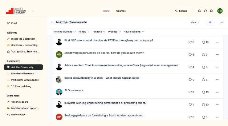 Briefings and talks from curated experts; Reddit-style forum for boardroom dilemmas; and regular Mastermind discussions.